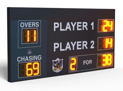 A very popular fixed LED cricket scoreboard is the CK-9D range. A 9 digit board is effectively the minimum to show a Cricket score. This gets you the number of wickets, runs, overs and what the chasing runs are.