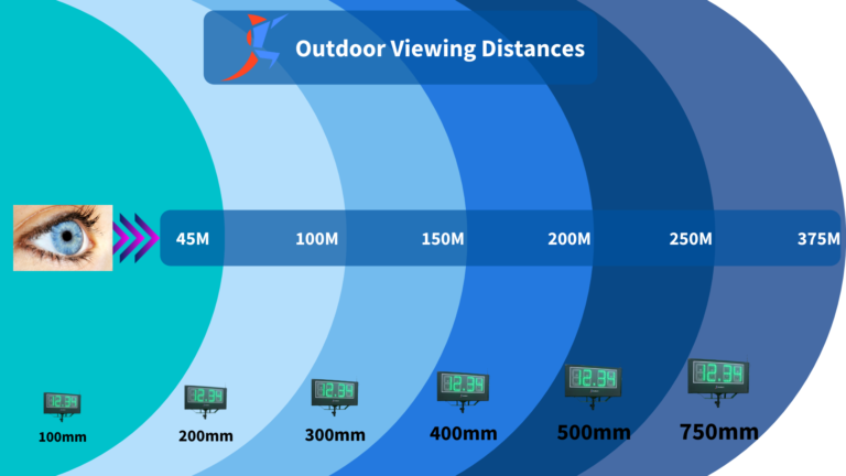 Start by using our digit viewing distance chart to calculate how far away your spectators will be from the scoreboard location. For example, if your spectators are 100 metres away, you should use 300mm as the smallest digit height.